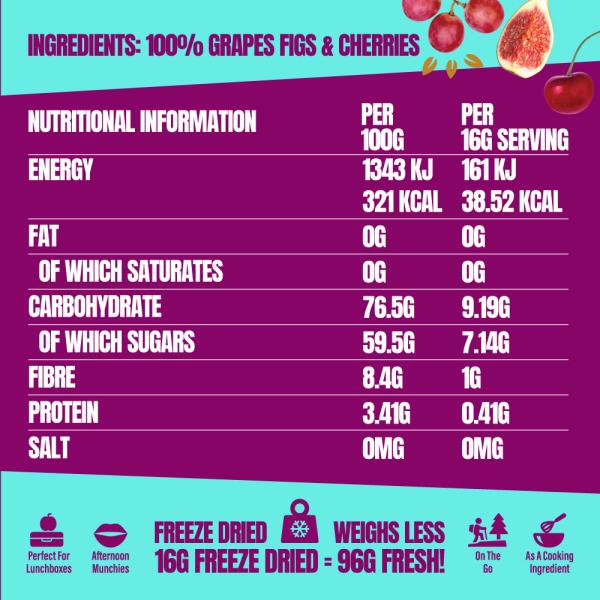 Rich and flavourful, our freeze-dried mix of grapes, figs, and cherries blends juicy sweetness with a satisfying crunch in every bite.