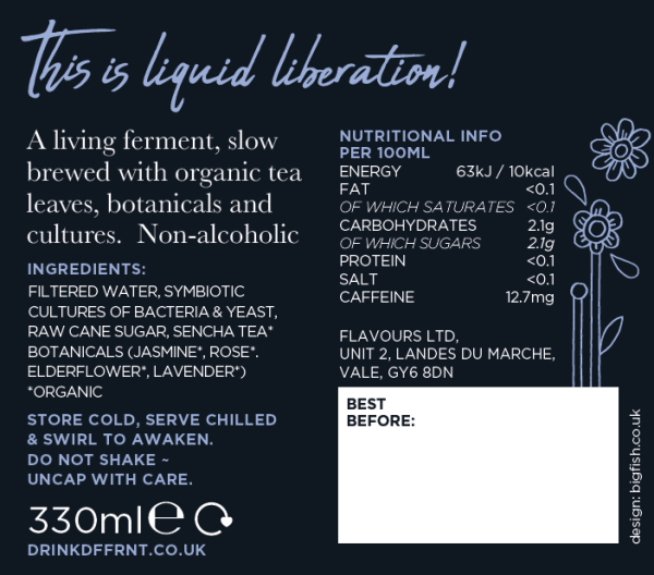 R/O Filtered Water Symbiotic Cultures of Yeast and Bacteria Raw Cane Sugar Organic Sencha Green Tea Organic Botanicals: Rose Elderflower Lavender