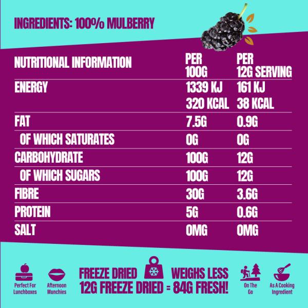 Freeze-dried mulberries are nutrient-dense, concentrating vitamins, minerals, antioxidants (like anthocyanins), and fibre from fresh fruit while removing water, offering a crispy, flavourful, low-fat snack with high carbohydrates and natural sugars.