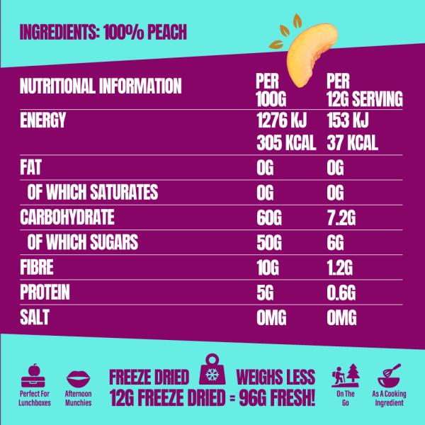 Freeze-dried peaches are nutrient-dense, low-calorie snacks that concentrate vitamins, minerals, and fiber, with virtually no fat or cholesterol, making them a healthy carb source rich in Vitamin C, A, potassium, and fibre.