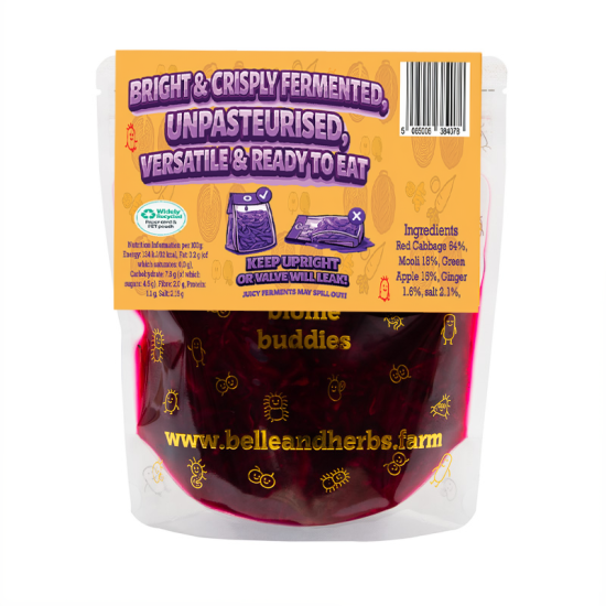 Our naturally slow fermented purple sauerkraut (Kraut) is ‘raw, live and unpasteurised’ it has a bright sweet and sour, earthy, gently gingery flavour and crunchy texture. It is packed full of gut friendly lactic acid bacteria and pro-biotics. It is very versatile, and adds the transformative sour flavour for perfect flavour balance in your meals .