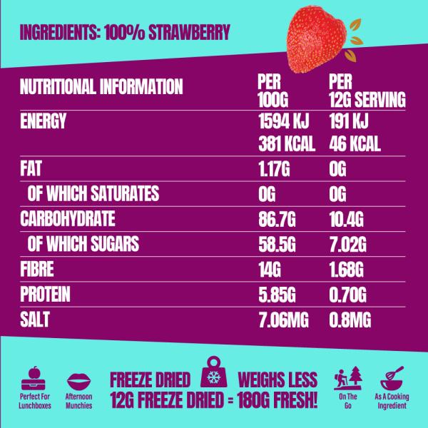 Freeze-dried strawberries are concentrated sources of nutrients, boasting high Vitamin C, fibre, and antioxidants, with minimal fat.
